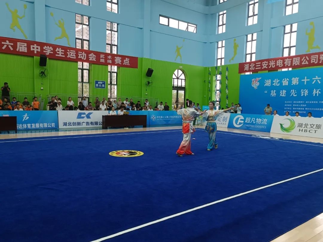7月30日下午,在湖北省第十六届中学生运动会武术比赛中,鄂州代表队郭传铭、陈诺霓两名运动员发挥出色,武技精湛,一举夺得女子对练项目金牌。武汉代表队、十堰代表队分别获得该项目银牌和铜牌。