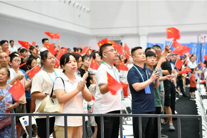 全场观众一起挥舞红旗