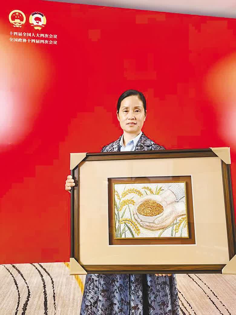 3月7日,出席十四届全国人大四次会议的全国人大代表、“女粮王”毕利霞,将一件特别的非遗汉绣作品带到了北京。这幅主题为“金饭碗”的作品,饱含着毕利霞和乡亲们的感恩之情。