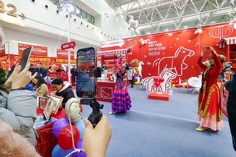 图为1月24日鄂州国际会展中心内,民族舞表演者边唱边卖货,吸引消费者、自媒体目光。春节将至,年味渐浓,鄂州推出“乐在湖北‘马’上有喜”新春市集嘉年华活动,以鄂城区吴都·乔街为主会场,五区同步端出“一区一特色”年味盛宴。