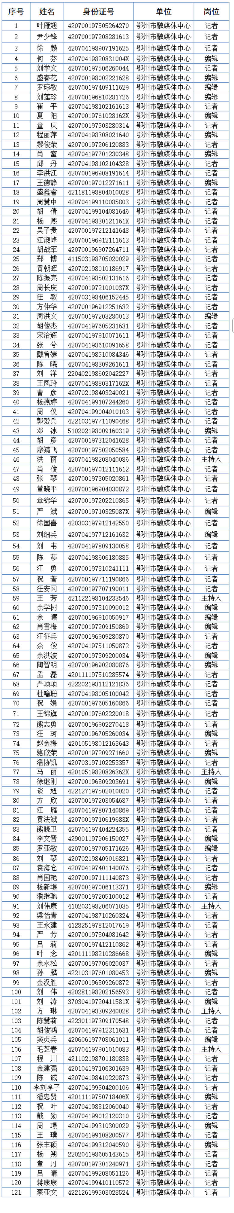 根据湖北省新闻出版局《关于开展2025年度新闻记者证核验工作的通知》要求,我中心对121名拟通过《新闻记者证》年度核验人员资格进行了严格审核,现将名单公示接受社会监督。
