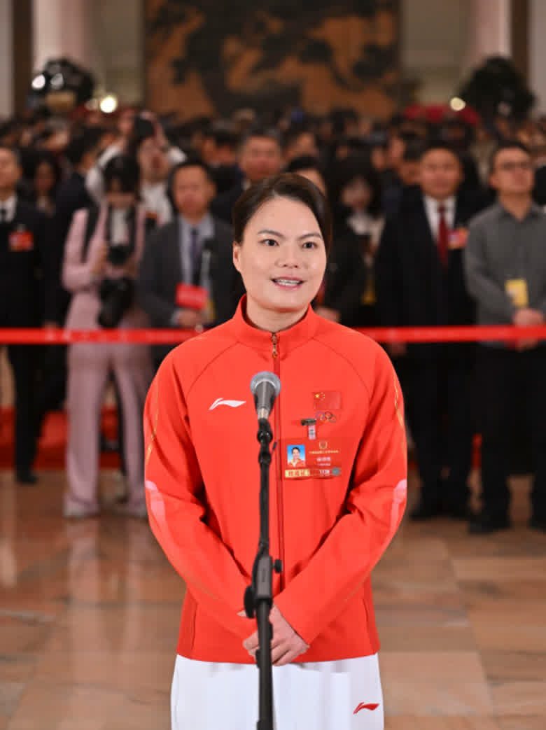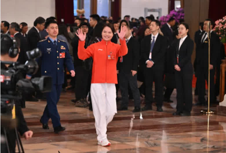 这是全国人大代表徐诗晓向记者挥手致意。